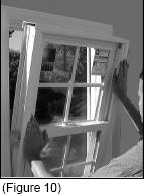 Place the new window in the opening. Rest the lower inside edge on the sill, tight against the stool. Tilt the window into the opening, making sure the sill angle is on the groove along the outer edge of the window. (See Figure 10)