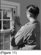 Check for plumb (vertical), level (horizontal), and square. It is important that the window remain square in the opening during installation, even if the opening itself is not square. Place shims behind the mounting screw holes, while checking to be sure that the window remains square. (See Figure 11)