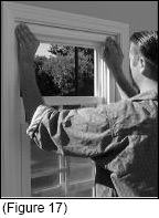 Push the head expander up tight against the upper part of the opening. (See Figure17) Replace the inside top molding tight against the head expander. Secure the head expander, if necessary, with the 2 small screws provided. Caulk before and replace the inside moldings tight against the jambs of the window. Caulk where the moldings meet the window to seal any gaps.
