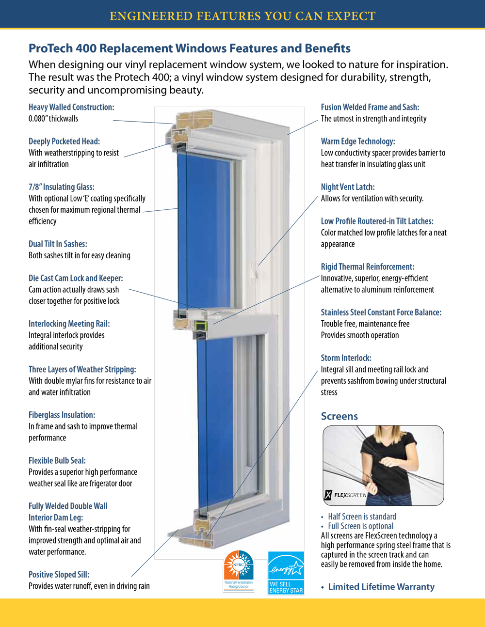 State of the Art Technology More than thirty years of research and development are built into every fully welded Pro-Tech 400 Series replacement window, producing state of-the-art designs using advanced production techniques. A technologically advanced fabrication process allows compound shapes to be fusion welded at sill corners, producing a window that is actually stronger than conventional welded windows. Innovative technology means unparalleled styling and top performance for homes of distinction.