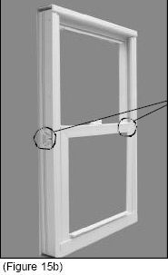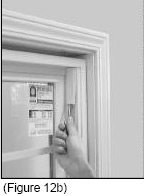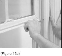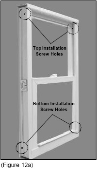 There are 2 screw holes in each jamb. There is 1 at the top, in the inside pocket, underneath the sash stop, and 1 at the bottom, in the outside pocket, underneath the sash stop. (See Figure 12). Remove the top and bottom sash stops by gently prying them out of the jamb (See Figures 12b and 12c).